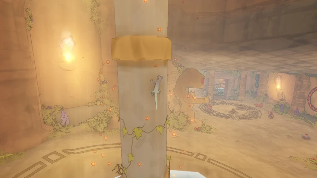 Esta sensación de confort no llega a ser completa sin la presentación visual y sonora del juego; los cálidos rayos de luz rebotando en paredes de piedra curtidas por tiempo y sal o el repiqueteo de tus patas que siempre suena distinto en cada leve diferencia de superficie. Gecko Gods es un juego que apetece habitar, en el que simplemente deambular sin rumbo es agradable. Y la banda sonora no se queda atrás. Habrá canciones que se abrirán paso sin vergüenza ninguna para que las escuches y les prestes atención. Es el ejemplo del tema que suena al coger el barco, que más allá de acompañar el gameplay consiguen destacar por sí mismas para elevar todo lo que ves y haces en pantalla, casi acercándose a esa canción perfecta que sonaba cuando íbamos a caballo de noche en Zelda Breath of the Wild.