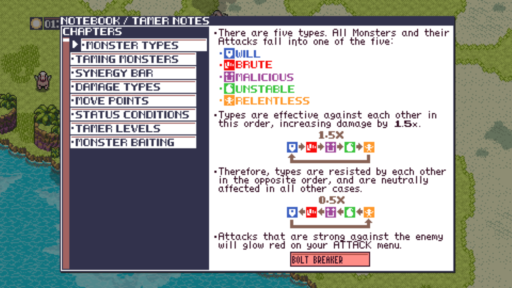 Y para el final me he dejado algo un poco menos importante, pero que refuerza lo antes mencionado: la tabla de tipos de Monster Crown. En un juego que intenta seguir los pasos de Pokémon pero diferenciarse lo suficiente, es normal encontrar una tabla de tipos que no sea exactamente igual a la del monopolio de los monster catcher, pero en Monster Crown se nos presenta un caso en los que la originalidad se aleja tanto de su inspiración, que se pasa de rosca y se vuelve algo incomprensible. En Monster Crown se nos presentan cinco “clases” o “elementos” que son Voluntad, Bruto, Inestable, Malicioso e Implacable, los cuales yo he acabado por denominar Defensivo, Bruto, Elemental, Oscuro y Bestia. Esto porque los nombres originales no solo no aclaran nada sobre los monstruos que pertenecen a ese grupo, sino que además no encuentro ninguna clase de lógica para las efectividades del juego (que, de izquierda a derecha, siguen el orden presentado volviendo a la rueda con que Bestia es super-efectivo contra Defensivo). Estos nombres por supuesto son algo personal, y que como alguien que se pasó la infancia dibujando Pokémon inventados que me habría gustado que existieran, he caído en los mismos errores que Monster Crown y he visto sus defectos.