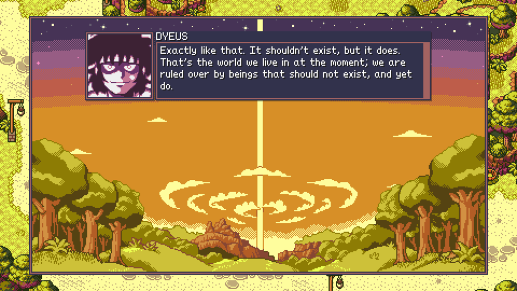 Hay que decir que la trama es interesante y aunque el jefe final del primer acto (el primer boss verdadero del juego) parece totalmente sacado de un Persona o Shinigami Tensei, fue satisfactoria la mazmorra para llegar hasta él, e, irónicamente se sintió menos frustrante que la cueva al lado del primer pueblo donde parece el paso lógico antes de avanzar la historia. Aun así te obliga a subir a nivel 32 para que no te mate a todos los monstruos de tu equipo, ya que los enemigos que aparecen por el campo rápidamente se vuelven triviales y ridículos debido a su bajo nivel y escasa variedad.