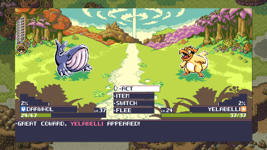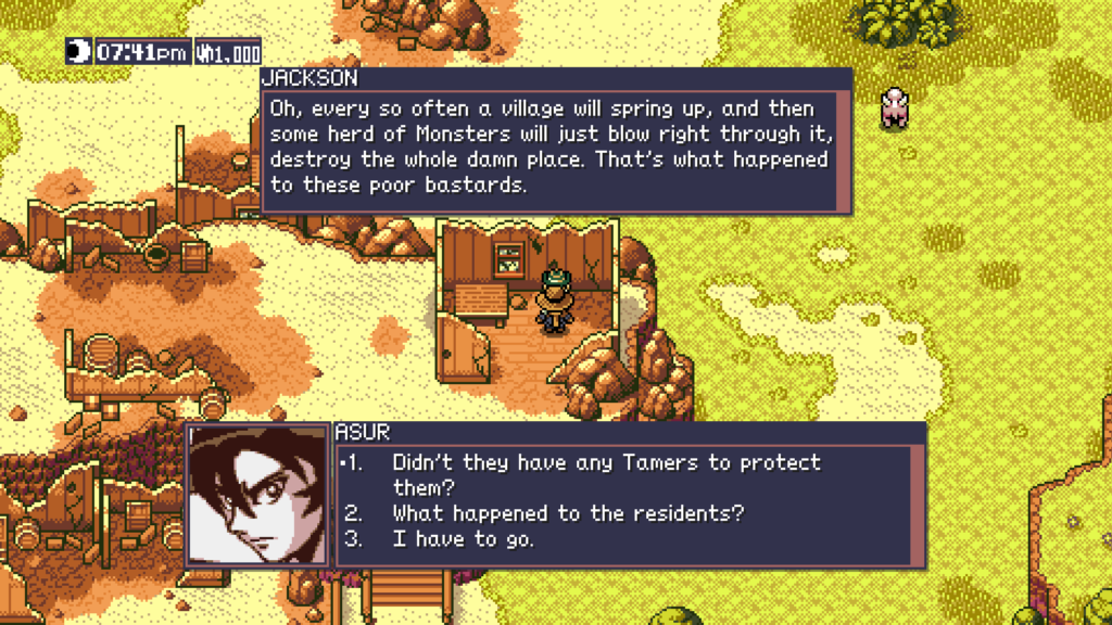 La estética y el diseño de los primeros monstruos es ciertamente entrañable, te atrapará si te gusta esa estética, pero cuenta con un movimiento libre (no adherido a cada tile del mapa) y mucho más detalle en los sprites de lo que parece. Además desde un principio se nota un diseño de personajes que también intenta imitar lo visto allá por los 90, lo cual te lleva inevitablemente a pensar en animes como Dragon Ball o Digimon.